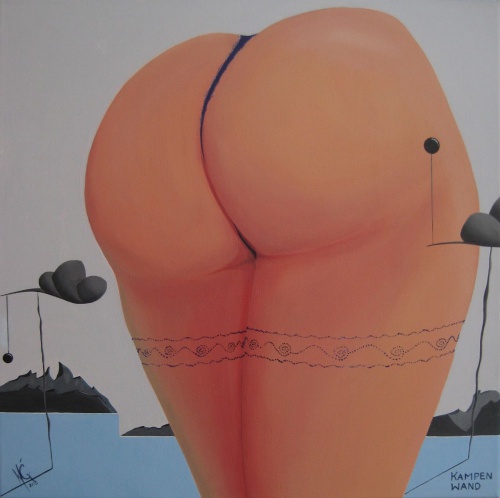 Den abschluss der serie 'bergfrauen' bildet die dame in weissen hotpants zu füssen des 'wendelsteins'. Gegenüber dem wendelstein liegt das 'kranzhorn' und zwischen den beiden zitiere ich aus meinem 'innportal': in tiefem türkis lasse ich den inn aus den bergen in den einstigen 'rosenheimer see' fliessen. In der darstellung der leicht bekleideten dame wird nochmal das surrealistische element aller frauendarstellungen dieser serie erkennbar: die dame sitzt – aber worauf? Die heuberg-dame steigt – aber welche stufe? Die hochries-frau besteht nur aus der silhouette – aber wie kann sie ihr zartes 'nichts' anziehen? Die kampenwand-frau – besteht sie nur aus gesäss und beinen? Die hochfelln-dame – hat sie den kopf verloren? Ich überlasse dich den rätseln. Neben dem rätselhaften verbindet alle bilder das 'wolken-thema' aus dunklen cumuli.