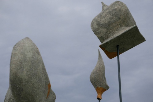 Außerdem bevölkern stilisierte bäume seit vielen jahre meine bilder. In den “scheinwelten” habe ich nun beides als skulpturen verwirklicht und erzeuge eine spannung mit dem kontrast zwischen den scheinbar schweren steinobjekten und den dünnen, biegsamen stangen.